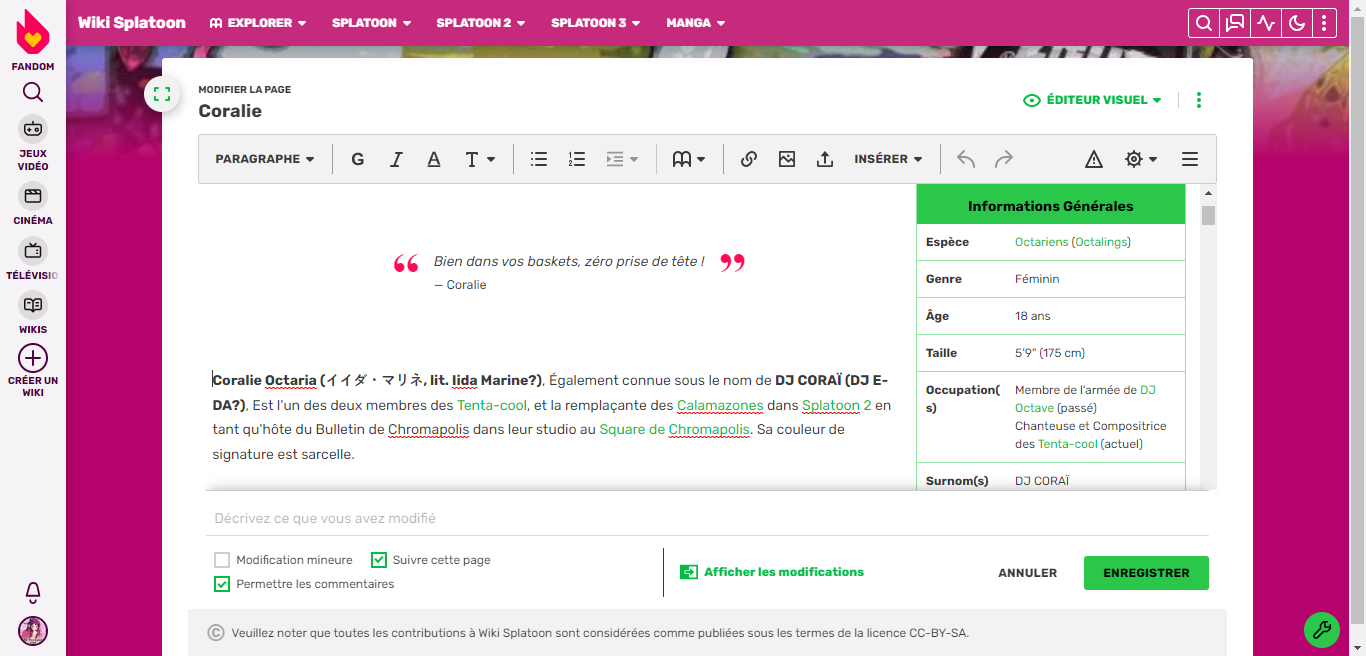 Modifier sur Fandom est généralement aussi simple que cliquer sur le bouton « Modifier » sur une page. Le faire vous emmènera sur une page de modification. C'est là que pouvez commencer à effectuer des changements sur la page — comme ajouter de nouvelles informations et médias ou mettre à jour le formatage du texte.