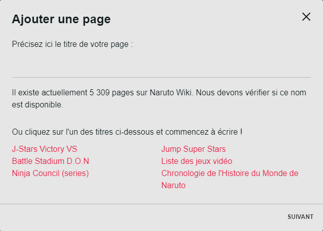 https://nomduwiki.fandom.com/fr/wiki/Nom de la nouvelle pageet cliquez sur le bouton CRÉER ou MODIFIER en haut à droite. - Taper un titre de page inexistant dans Spécial:EditPage.