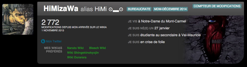 Bonjour à tous ! Je me présente, je suis HiMizaWa (pour les intimes HiMi), jeune fille âgée de 16 ans , je vis au Canada, et j'adore les mangas et les animes (vous avez sûrement déjà remarqué) ! Je vis pour les animes, je pense aux animes, je rêve aux animes, je... (non je plaisante, mais c'est pas complètement faux non plus). Je suis membre de Wikia depuis le 5 septembre 2011 ! D'habitude je ne suis pas très ouverte (et je le suis toujours), je trouve ça gênant de parler avec des personnes XD. Je n'ai pas beaucoup de passe-temps, à part lire, dessiner, écouter de la musique et naviguer sur internet ! Le seul sport que je fais c'est du jogging. Comme activité à l'école, je fais de la radio étudiante. Bref, passons, je suis administratrice sur beaucoup de wikias « anime », notamment sur le Wiki Shingeki no Kyojin, Wiki Bleach et Wiki Durarara. Bien sûr, j'aide aussi d'autres wikias, toujours de catégorie « anime », et je ne me gêne pas pour changer quelques trucs ou rajouter des modèles.