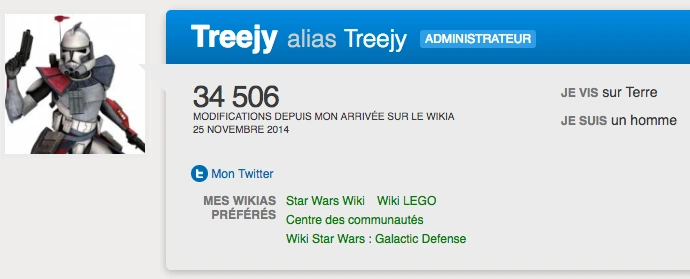 Sur Wikia, je suis Treejy, administrateur et bureaucrate du Wikia Star Wars depuis plus d'un an. Vous vous en doutez, je suis fan de Star Wars et de manière plus générale de science-fiction et de fantasy. Je suis beaucoup l'actualité autour de ces univers ainsi qu'autour de l'univers du gaming et des nouvelles technologies en général qui m'intéressent beaucoup.