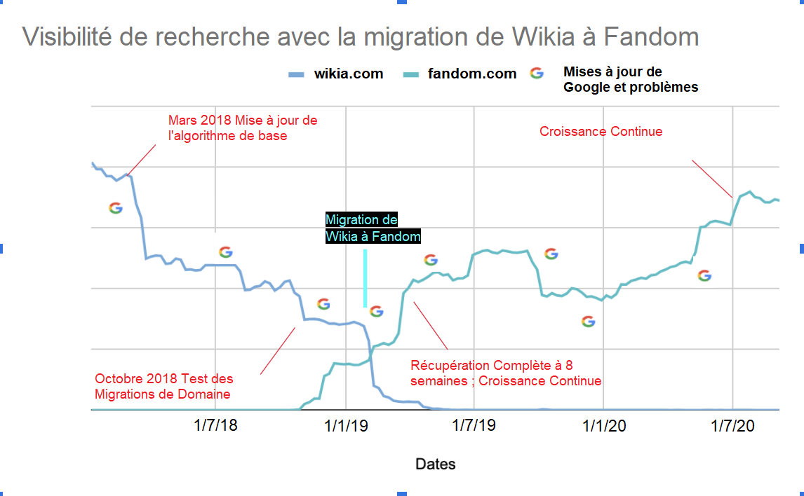 L'algorithme de Google est un secret très bien gardé. On ne sait pas encore très bien comment les changements apportés à cet algorithme affectent les wikis de Fandom et de Gamepedia, mais ce que nous savons, c'est que la force de la marque et l'unité du domaine peuvent protéger les wikis des baisses de référencement et dans le même temps apporter des avantages. Avec ces changements d'algorithme qui se produisent environ 4 fois par an, les wikis de Gamepedia pourraient perdre jusqu'à 40 % de leur visibilité de recherche en 2021 ou gagner jusqu'à 70 % de visibilité en migrant vers des URL Fandom. Les premiers tests de migration nous aideront à affiner ce chiffre, à devenir plus précis au fil du temps et à comprendre l'impact sur le trafic associé. Pour le contexte, avec les migrations des domaines Wikia.com vers Fandom.com en 2018, nous avons vu les communautés de test commencer à gagner en puissance et en terme de classement en l'espace de 8 semaines. Cette migration continue de réparer les dommages causés par le changement majeur de l'algorithme de Google en 2018, qui a défavorisé le domaine Wikia tout en favorisant celui de Fandom. Il faudra faire des tests pour en être sûr, mais nous attendons des résultats similaires pour les domaines Gamepedia et Fandom.
