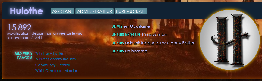 Je suis Hulothe, un lycéen de 15 ans passionné par Harry Potter, l'informatique et, par-dessus tout, Wikia. Je suis un assistant francophone depuis peu et je contribue principalement sur le wiki Harry Potter sur lequel je suis administrateur.