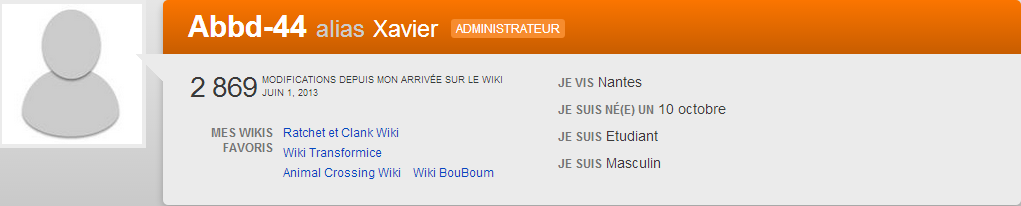 Je suis un jeune lycéen de 16 ans venant de la petite ville de Pontchâteau en Loire-Atlantique et je suis bureaucrate du Wiki Ratchet & Clank. J'apprécie le sport, la musique même si je n'en pratique aucun et j'assume jouer plusieurs heures sur ma console de jeu et mon ordinateur. Je passe régulièrement du temps sur ce-dernier après les cours pour regarder des vidéos, parler avec mes amis et aussi passer un peu de temps sur le site. :)