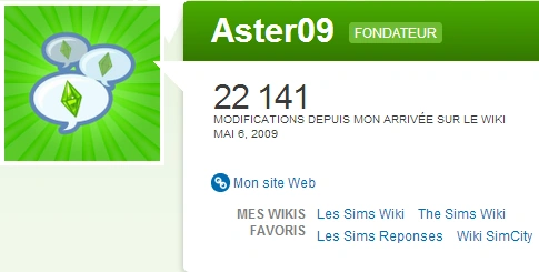 Je suis Aster09, fondateur du wiki Les Sims et du wikiréponses Les Sims, ainsi qu'administrateur sur le wiki MySims, SimCity et le wiki portugais Les Sims. Je ne suis pas un gros joueur en matière de jeux vidéo mais j'ai eu un vrai coup de cœur pour Les Sims depuis le tout premier opus, c'est donc un immense plaisir pour moi que de développer un wiki dédié aux Sims.