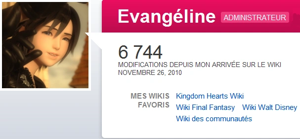 Pour ce portrait, le Wikien, ou plutôt la Wikienne que nous vous présentons est Evangéline, administratrice du Wiki Kingdom Hearts, du Wiki Disney et bureaucrate du Wiki Final Fantasy.