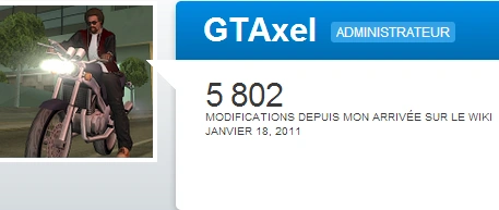 Sur Wikia, mon nom d'utilisateur est GTAxel. Je me suis inscrit le 18 janvier 2011, il y a plus de deux ans, pour contribuer essentiellement sur Grand Theft Wiki (dont je suis administrateur) car je suis un passionné de la série de jeux vidéo Grand Theft Auto. Dans la vie, je suis étudiant en France où je réside depuis ma naissance, j'ai appris l'allemand et l'anglais pour voyager en Europe sans avoir trop de mal à me faire comprendre. La qualité que j'essaie toujours d'appliquer à mes contributions sur le wiki GTA, c'est la rigueur : avec des articles standardisés, bien orthographiés et harmonieux, j'ai toujours été convaincu que nous prouverions notre sérieux et la qualité de nos informations. Il me semble d'ailleurs que le wiki a gagné en fiabilité et en tenue depuis quelque temps !