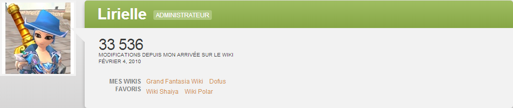 Je m'appelle Lirielle, pseudo sous lequel je joue ou ai joué à différents MMORPG en ligne. Je suis sur Wikia depuis décembre 2006. Je suis administrateur des wikis Dofus, Shaiya, Grand Fantasia FR et Aura Kingdom FR et fondateur du wiki Polar.