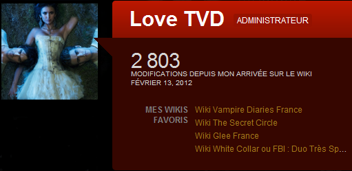 Je suis administratrice du wiki Vampire Diaries francophone et fondatrice du wiki The Secret Circle francophone. Je suis étudiante et je viens contribuer aux wikis durant mon temps libre.
