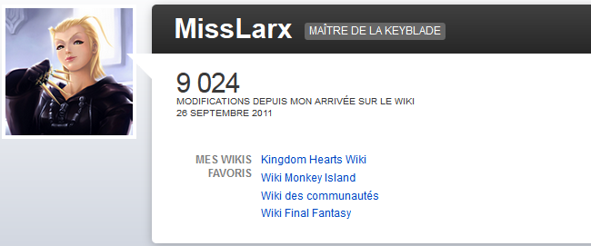 Je suis MissLarx, membre de Wikia depuis le 26 Septembre 2011. Je suis Assistante Wikia, Administratrice des wikis Kingdom Hearts et Disney, Bureaucrate du wiki Final Fantasy et récente Fondatrice du wiki Monkey Island. Je suis également, en dehors de Wikia, rédactrice sur le site monkeyisland.fr.